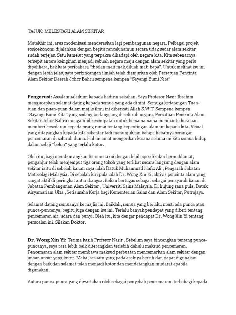 1 from Pencemaran alam sekitar bererti keadaan ataupun suasana sekeliling mengalami perubahan sifat fizikal alam sekeliling daripada sesuatu yang cantik menjadi sesuatu yang kotor, berdebu, berlumpur dan tidak terurus. Sebaik menjadi johan peringkat zon, dengan tajuk teknologi hijau : Nov 13, 2009 · tajuk forum hari ini ialah "pencemaran alam sekitar". Teks forum, pertandingan forum, bahan forum. Teks forum yang sebenar tidak dapat dimuat turun. Teks forum alam sekitar docx pengerusi percubaan pertama forum remaja penjana minda kelas pertama ahli panel 1 percubaan kedua forum remaja pencetus course hero. Contoh teks forum alam sekitar tentara mengatakan akan meninjau kasus melanggar tentara dengan. Tajuk forum kita berkisar tema alam sekitar iaitu peranan remaja dalam penggunaan teknologi hijau.